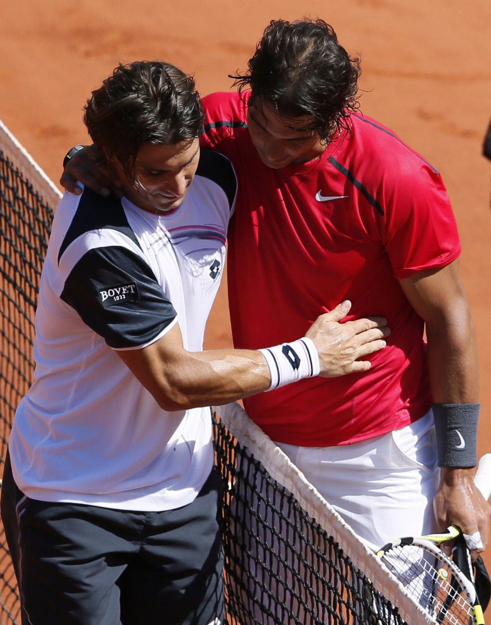 Sin casi público en la grada, el partido arranca con la previsibilidad de la película que ya se ha visto. Como siempre, Ferrer comienza firme, vibrante, brillante incluso: se apunta seis de los primeros siete puntos y amenaza con poner a Nadal contra las cuerdas. Como siempre, el mallorquín va capeando como puede el temporal, convencido de que ya llegará su momento, de que ya ha vivido esa tormenta, de que ya sabe que escampa, pasa y termina sin que él se haya ahogado. Como siempre, se cumple la previsión del número dos mundial, que poco a poco va desgastando al número seis. Ferrer quiere jugar a toda prisa, porque es capaz de imponer un ritmo infernal, el más alto del circuito. Nadal le va poniendo freno deteniendo el partido, alargando los peloteos, congelando el tiempo. A la que el mallorquín enjuga la segunda bola de break a la que se enfrenta, rompe el saque de Ferrer y se dispara hacia la victoria: por ejemplo, en todo el segundo set, solo pierde cuatro puntos con el saque.Pese a la comodidad de su triunfo (es la semifinal parisina en la que menos juegos ha perdido Nadal en su carrera) la victoria deja conclusiones interesantes. De nuevo, el saque acudió al rescate del mallorquín, quien ante uno de los mejores restadores del planeta firmó esta secuencia desde el peligroso 1-2 y 30-40 de la primera manga: segundo saque a la línea, ace, doble falta, y, tras frenar una segunda bola de break en ese parcial, saque ganador y saque ganador. Ferrer perdería su siguiente juego en blanco. Vería en el segundo set que Nadal le ganaba un punto tras trastabillarse, aposentar el trasero en el albero y volver a levantarse. Capitularía, finalmente, ante el mejor tenista que ha jugado en el siglo XXI sobre tierra. Eso es hoy. Mañana puede ser otra cosa: un solo partido, una sola victoria, alzar un séptimo título de récord, convertiría a Nadal en el mejor jugador de toda la historia de la arcilla.